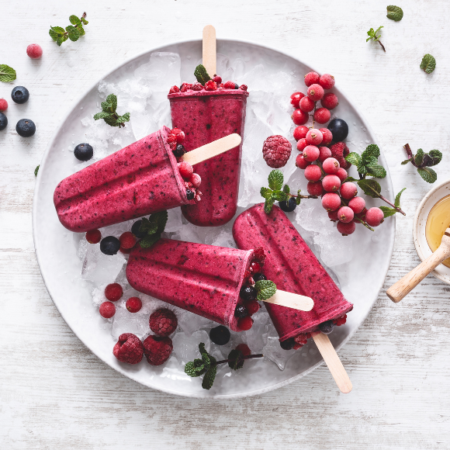 Je kunt een handje diepvriesfruit apart houden om toe te voegen als decoratie. Dit kan je toevoegen als je de ijsvormpjes vult met het mengsel.